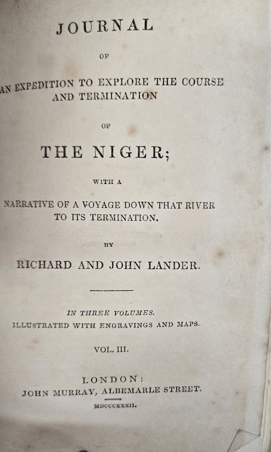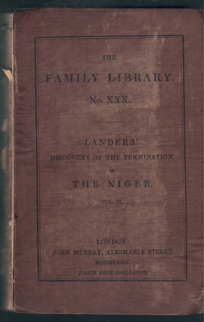 Lander, Richard and John Lander; LANDERS' DISCOVERY OF THE TERMINATION OF THE NIGER VOL. 3; John Murray; Very Good with no dust jacket; Reprint; 1932; Binding intact but spine paper worn away, hinges weak. Dealer label to front free-endpaper, light foxing to pages. Frontis photo, tissue-guard overlay.;