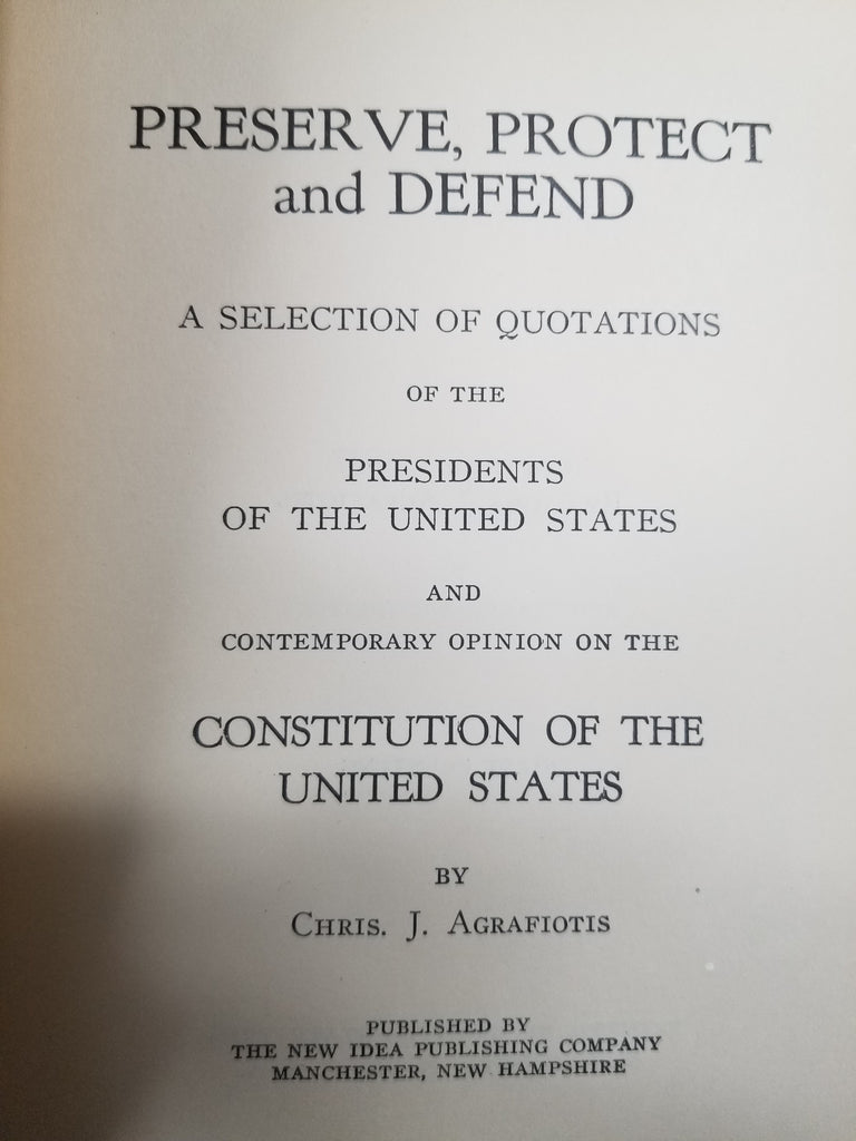 Agrafiotis, Chris J; Preserve, protect and defend;; The New idea Pub. Co; Very Good with no dust jacket; First; 1937; Maroon boards tight and straight, inner pages clean and unmarked. 223pp plus full text of U. S. Constitution.;