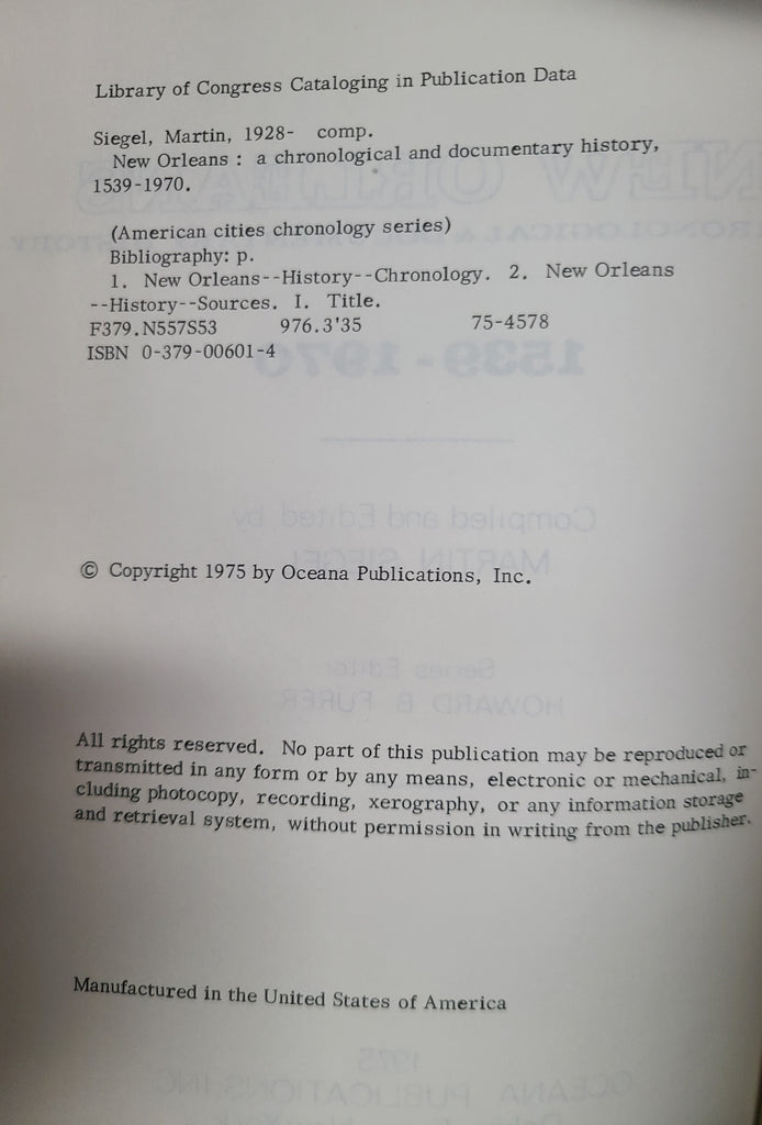 Siegel, Martin and Howard B. Feur (Series editor); NEW ORLEANS; Oceana Pubns; Near Fine with no dust jacket; First; 1975; Orange cloth boards tight and straight, inner pages unmarked. Includes bibliography and name index.;