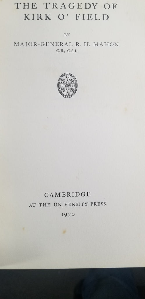 Majon, R. H.; THE TRAGEDY of KIRK O' FIELD; Cambridge; Very Good with no dust jacket; First; 1930; 1/4 blue cloth over cardboard. Spine tan label still readable. Binding tight and straight, inner pages clean and unmarked. B/w frontis photo, "Kirk o'Field from north to south." Mild foxing to first few pages.;
