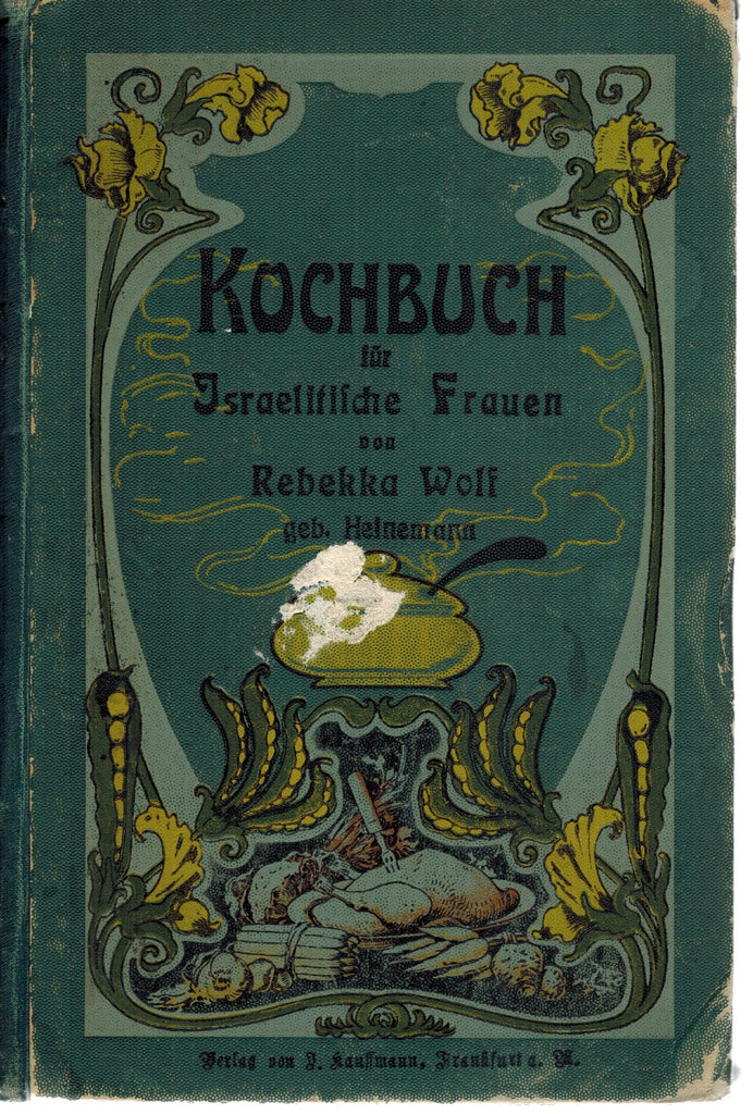 Wolf, Rebekka; KOCHBUCH FÜR ISRAELITISCHE FRAUEN MIT EINER VOLLSTÄNDIGEN SPEISEKARTE SOWIE EINER GENAUEN ANWEISUNG ZUR EINRICHTUNG UND FÜHRUNG EINER RELIGIÖS-JÜDISCHEN HAUSHALTUNG.; J. Kauffman; Good+ with no dust jacket; Reprint; 1901; Text in German. Pictorial boards rubbed at extremities. Green/yellow illustration still bright. Binding very lightly shaken, still fully intact,. Inner pages age-toned but clean and unmarked. Jewish cookbook "including menus and various types of cooking and baking with a full menu and a medicine cabinet and a detailed instruction on setting up and management of a religious Jewish household.";