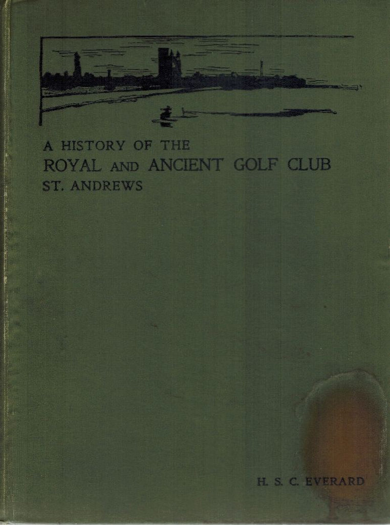 Everard, H.S. C.; A History of the Royal and Ancient Golf Club St. Andrews From 1754-1900; William Blackwood & Sons; Very Good with no dust jacket; First; 1907; 2" copper-colored stain to bottom right edge, front board. Edgewear to extremities, but overall binding sturdy, corners very lightly bumped. Foxing to front endpapers. Inner pages and photos bright and unmarked. Top-edge gilt, rough-cut pages. Frontis photo, 9 color illust. 30 full-page photo illust. Contents include: Early References to Golf At St. Andrews, First Competition, Method of Scoring, A Tariff for Payment of Caddies, Ownership of the Links, The Open Championship;