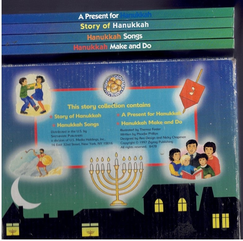 Phillips, Phoebe; MY VERY OWN HANUKKAH BOX; Smithmark Pub; Near Fine with no dust jacket; Reprint; 1997; Includes 4 board books and pictorial cardboard carrying case, with handle. Books are 4-page sturdy, washable board books. Titles include: Hanukkah Make and Do, Hanukkah Songs, Story of Hanukkah, A Present for Hanukkah. Books are clean and appear unread. Carrying case shows light rubbing, still clean and intact.;