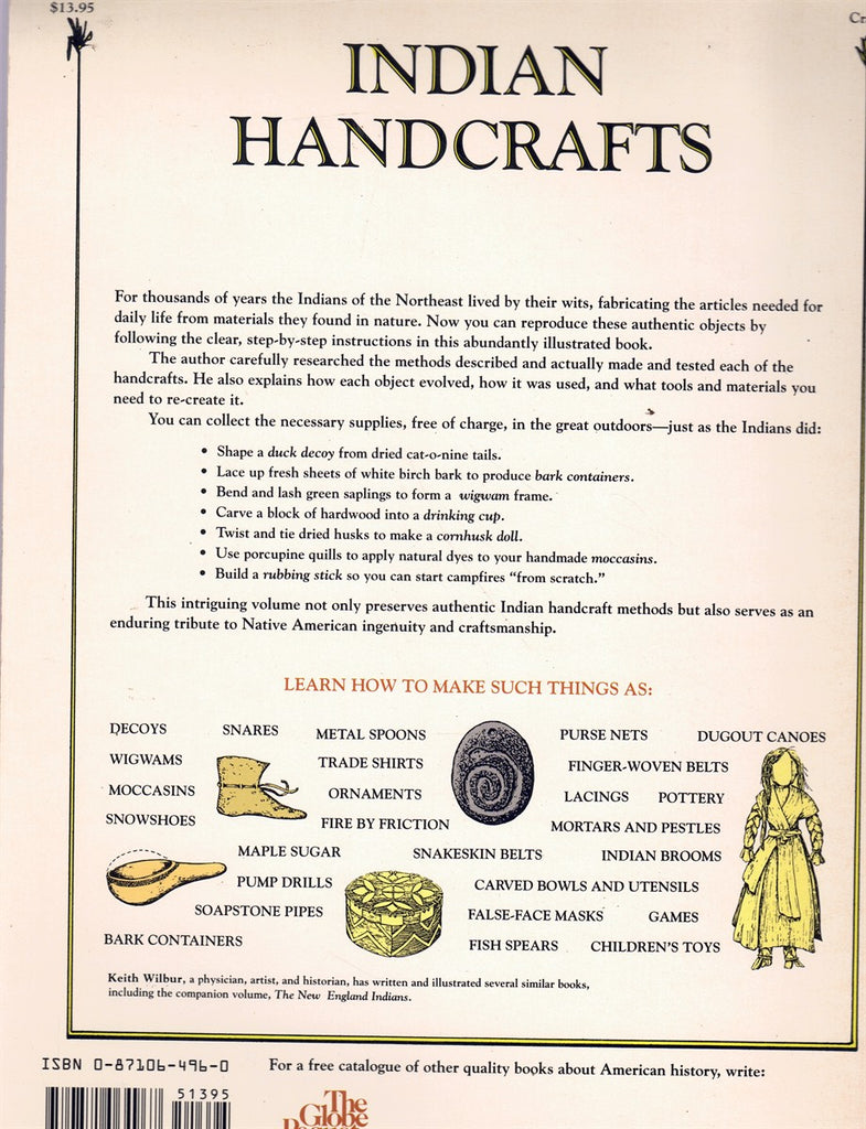 Wilbur, C. Keith; INDIAN HANDCRAFTS; Globe Pequot; Very Good; Reprint; 1990; Light shelfwear to covers. Binding tight and straight, inner pages clean and unmarked.;