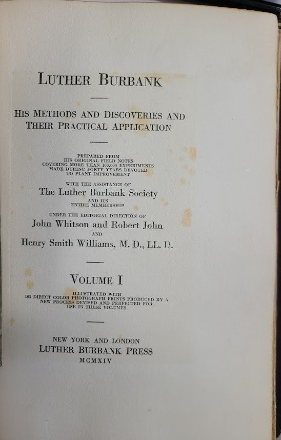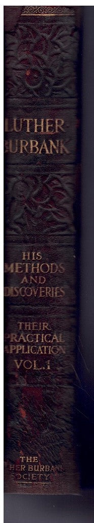 Whitson, John, and Robert John and Henry Smith Williams, editors; LUTHER BURBANK HIS METHODS AND DISCOVERIES THEIR PRACTICAL APPLICATION 12 VOLUMES; Luther Burbank Press; Very Good with no dust jacket; Reprint; 1914; 12-Volume, set. General wear to extremities on all volumes. Vol. 2 Rear boards partially detached. All other bindings sound, inner pages clean and unmarked. Embossed leather. Top edge gilt. Orange tree design to boards and spines. Gilt owner name stamped on volume 1 pastedown. Green patterned endpapers. Tipped-in color plates, (single and double-plated. ) Sporadic foxing to endpapers.;