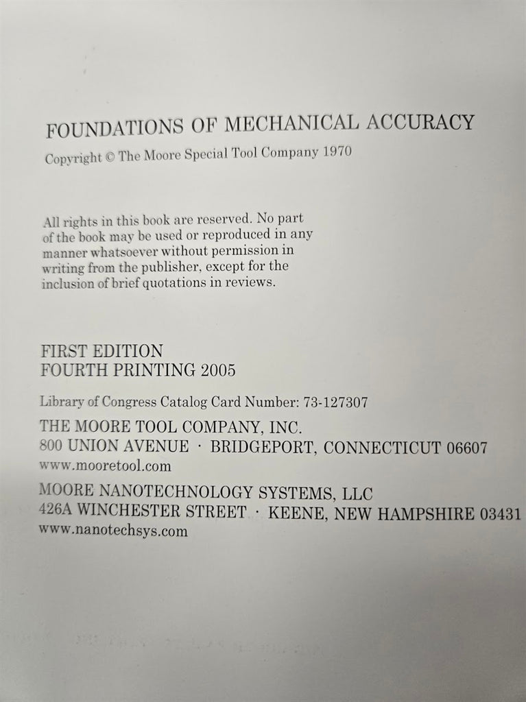 Moore, Wayne R.; FOUNDATIONS OF MECHANICAL ACCURACY; Moore Special Tool Co; Very Good in Good+ dust jacket; First; 1970; Dust Jacket is flap-intact, creases and few closed tears, now protected within mylar cover.;